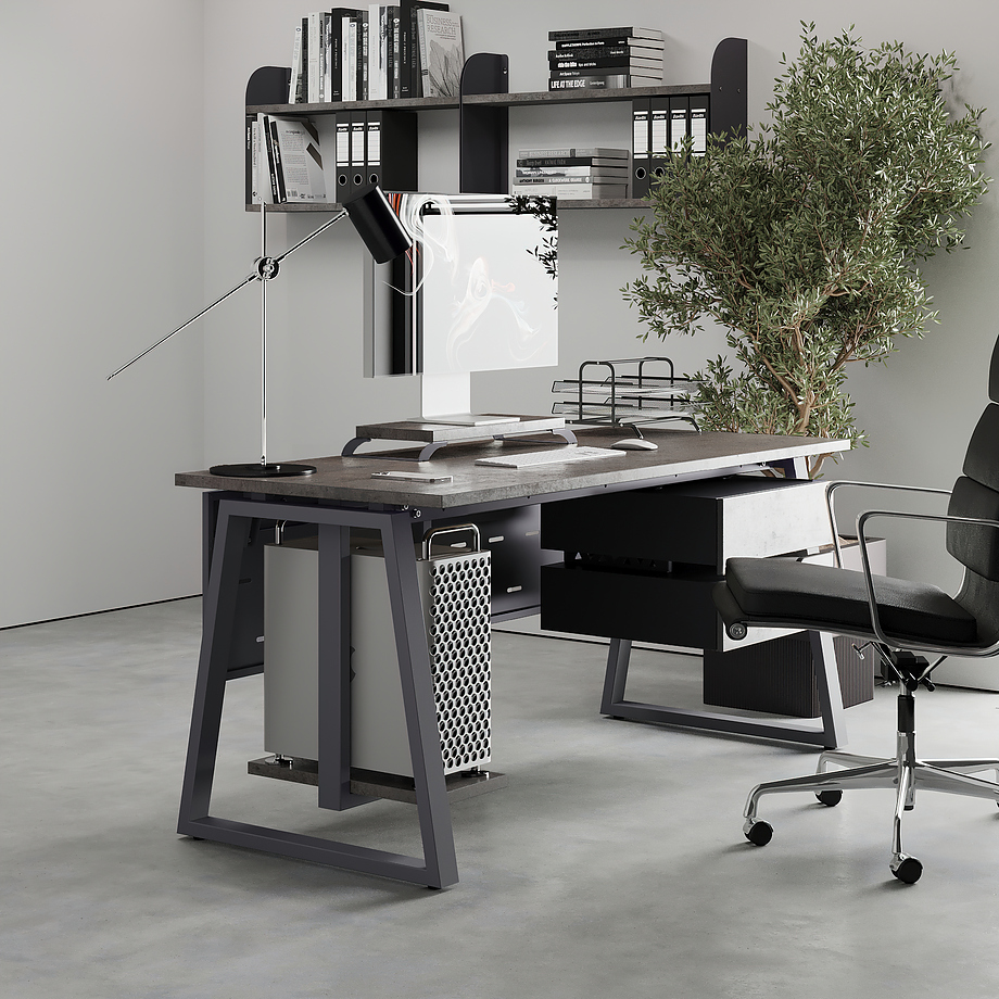 Офисный стол КОБОР TR-140/70 graphite/chicago используется в офисных помещениях и кабинетах руководителей. Модель оснащена трапециообразными опорами. Материал столешницы - прочный ЛДСП толщиной 25 мм, усиленная снизу металлическим каркасом, материал опор - окрашенный металл.