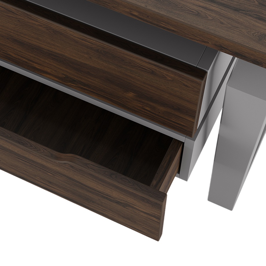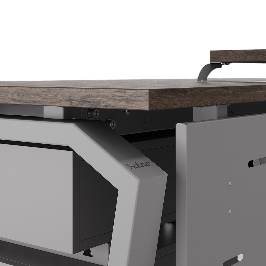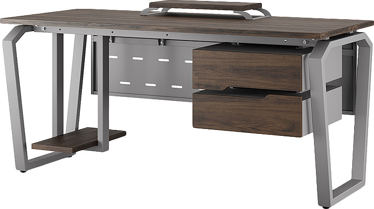 Офисный стол КОБОР TB-140/70 aluminum/charlston используется в офисных помещениях и кабинетах руководителей. Конструкция модели включает опоры, выполненные в виде перевернутой трапеции со скошенными верхними углами. Материал столешницы - прочный ЛДСП толщиной 25 мм, усиленная снизу металлическим каркасом, материал опор - окрашенный металл.