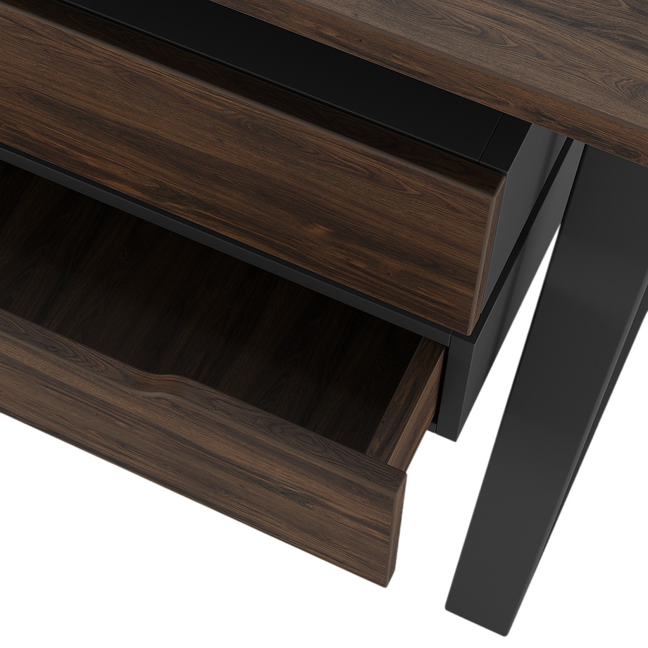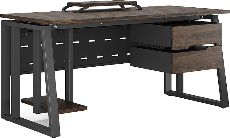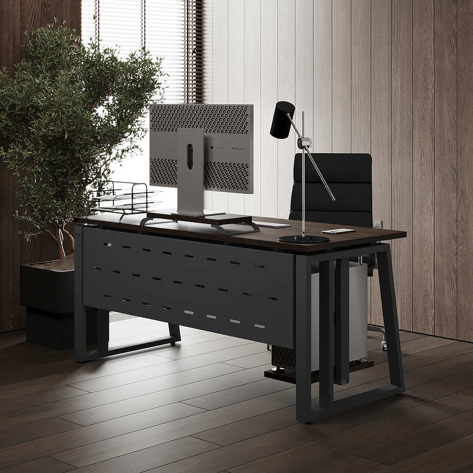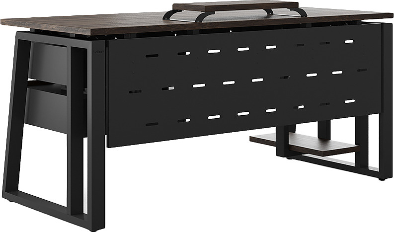 Офисный стол КОБОР TS2-120/60 black/charlston используется в офисных помещениях и кабинетах руководителей. Модель оснащена опорами в форме наклонной трапеции с усиленными вертикальными балками. Материал столешницы - прочный ЛДСП толщиной 25 мм, усиленная снизу металлическим каркасом, материал опор - окрашенный металл.