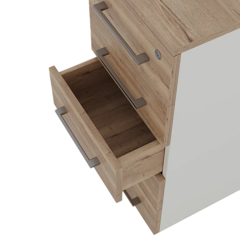 Приставная тумба Кобор TS5-40/70 white/natural предназначена для хранения документов, канцелярских принадлежностей и других мелочей в офисных и коммерческих помещениях, а также в учебных заведениях. Тумба станет удобным дополнением рабочего пространства, и её можно разместить как под столом, так и рядом с ним, адаптируя пространство под свои задачи. Модель оснащена 5 выдвижными ящиками и 4 регулируемыми по высоте опорами. Материал корпуса - прочный ЛДСП толщиной 16 мм, материал столешницы и ящиков - прочный ЛДСП толщиной 25 мм, материал задней стенки - окрашенный металл.