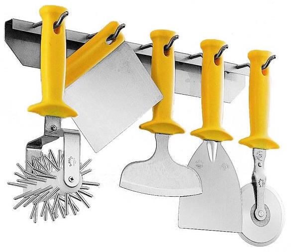 Набор для пиццы LILLY CODROIPO 189 используется на предприятиях общественного питания и торговли для производства и выпечки пиццы. В комплект входят: перфоратор для теста, шпатель 12 см, резак-ролик, резак-полумесяц и скребок. Все изделия выполнены из нержавеющей стали, рукоятка - из желтого термостойкого пластика.