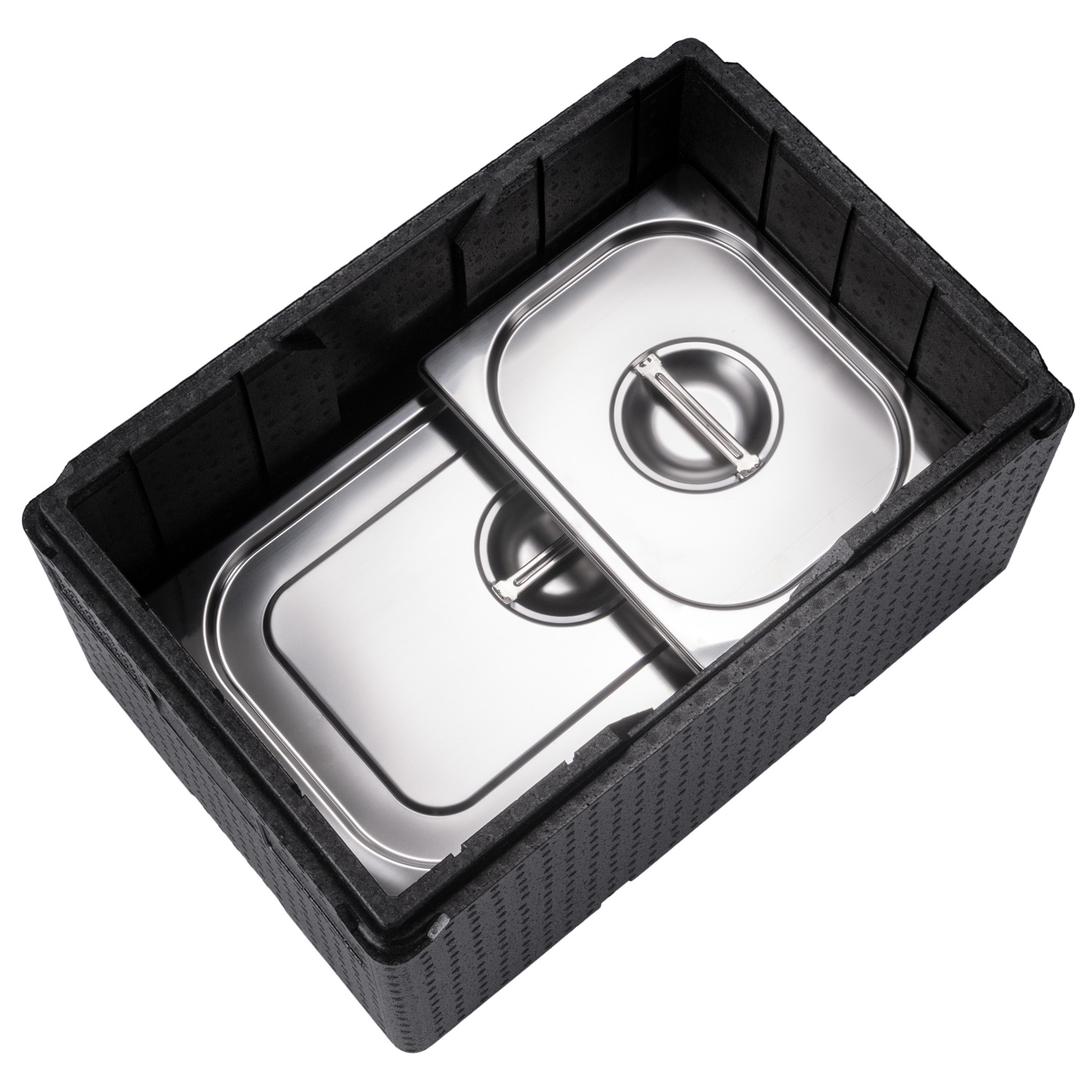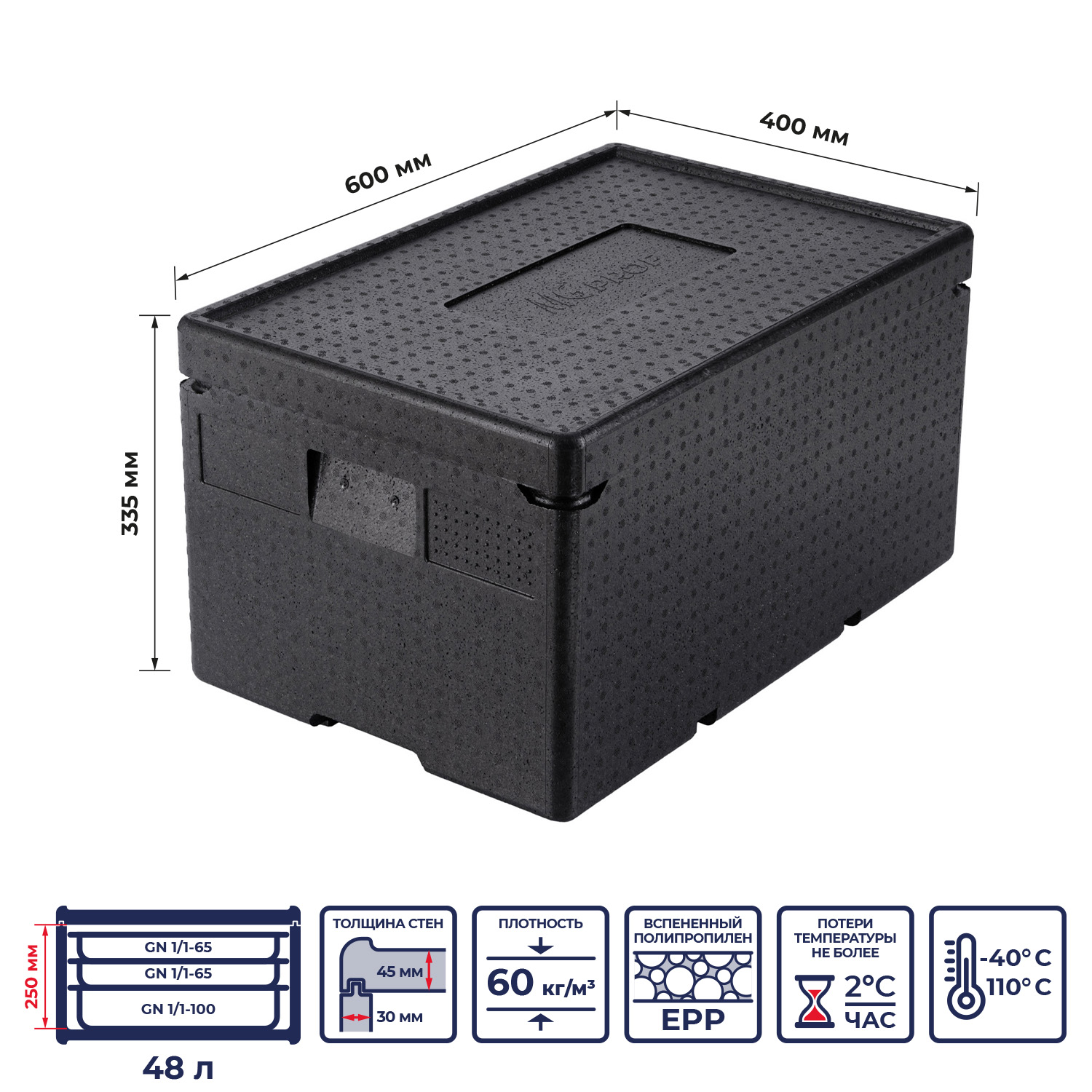 Термоконтейнер MGprof используется для хранения и перевозки горячих и холодных блюд на предприятиях общественного питания, торговли, пищевых производствах, кейтеринговых компаниях, а также для доставки в школы, офисы, предприятия других сфер, в военных-полевых условиях, на рыбалке, туристической деятельности и прочих сферах. Модель оснащена крышкой. Материал корпуса - вспененный полипропилен плотностью 60 кг/м³.