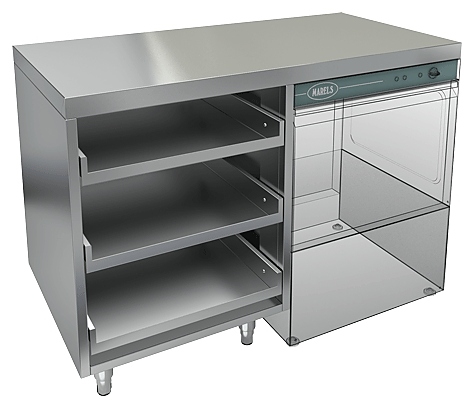 Открытый стол HICOLD НБМКБКП-12/6Л используется на предприятиях общественного питания, торговли, в гостиничном бизнесе и других сферах для комплектации барных стоек и размещения посудомоечной машины. Стол оснащен специальным крылом, под которое встраивается посудомоечная машина и 3 полками для корзин с бокалами. Материал корпуса - нержавеющая сталь AISI 430, столешница усилена листом ДСП.