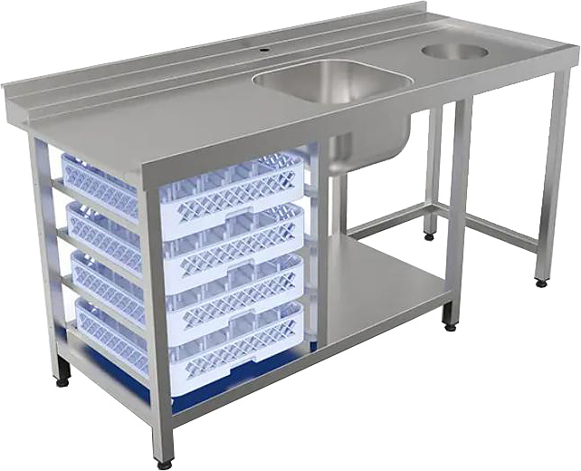 Входной стол Кобор СПМ/2-170/70/П используется на предприятиях общественного питания, торговли, в гостиничном бизнесе и других сферах для комплектации барных стоек и размещения посудомоечной машины. Стол оснащен отверстием под смеситель, отверстием для сбора отходов, 4 уровнями направляющих для посудомоечных кассет, полкой и бортом. Материал каркаса - труба из нержавеющей стали (40x40 мм), материал столешницы - нержавеющая сталь AISI 430.