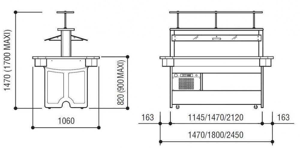 • Данная модель обладает небольшими габаритами – 1470x1060x1470 мм – что позволяет использовать её даже в небольших по площади заведениях. При этом шарнирные колёсики с блокирующим механизмом дают возможность при необходимости вывезти салат-бар на кухню или в подсобное помещение.