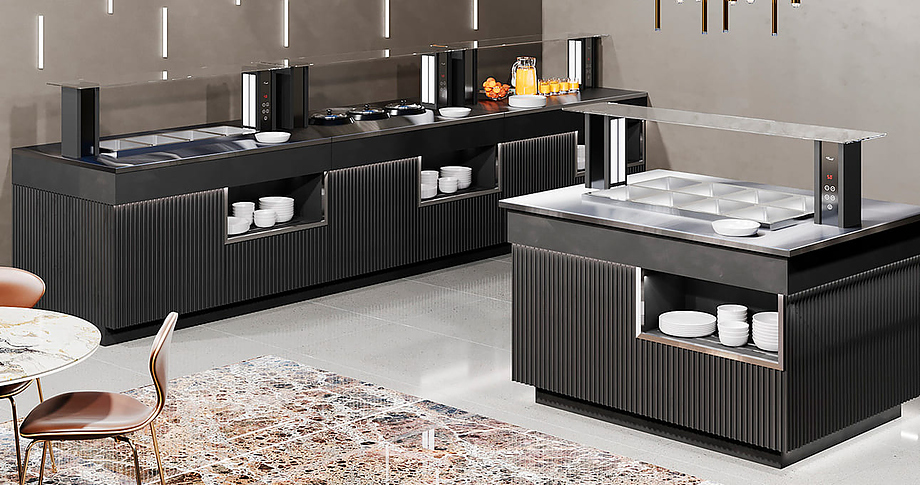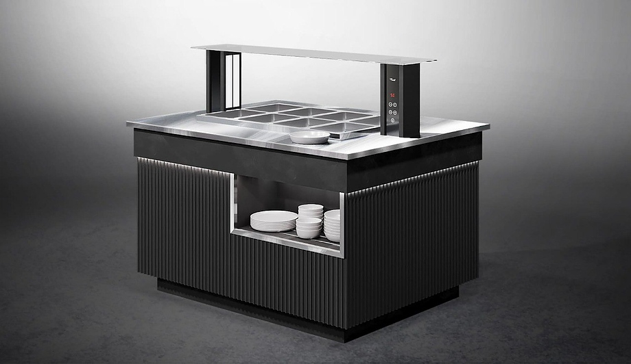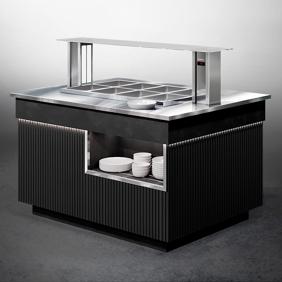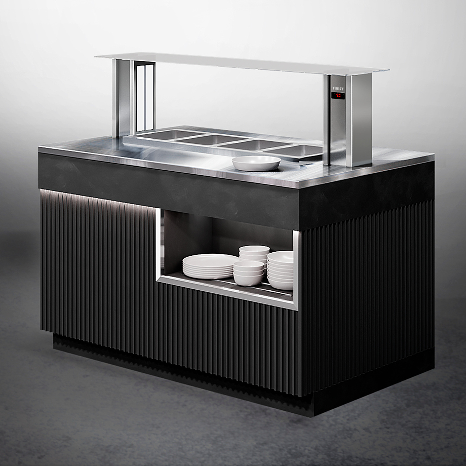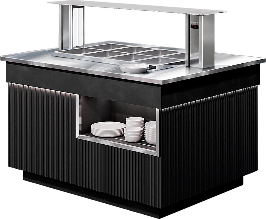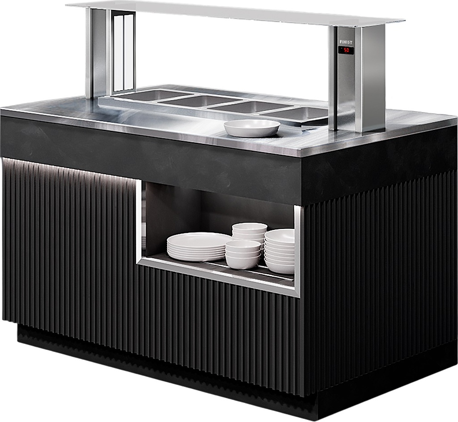 Стол шведский Enofrigo Finist ШСм1825 используется на предприятиях общественного питания, торговли и пищевых производствах для кратковременного хранения горячих блюд, а также для их демонстрации и раздачи в формате самообслуживания. Модель с микропроцессорным блоком управления, подставкой, столешницей, подогреваемой ванной для гастроемкостей, светодиодным освещением и нишей для хранения посуды и инвентаря.Материал столешницы - высококачественная нержавеющая сталь, материал облицовки панели корпуса - МДФ с покрытием дизайна «Сидней» черного цвета, материал верхней полки - просветленное стекло.