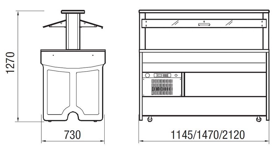 • Салат-бар легко подключить в любом месте, где имеется электрическая розетка с напряжением 220 вольт. Удобство в транспортировке даёт наличие роликовых колёсиков.