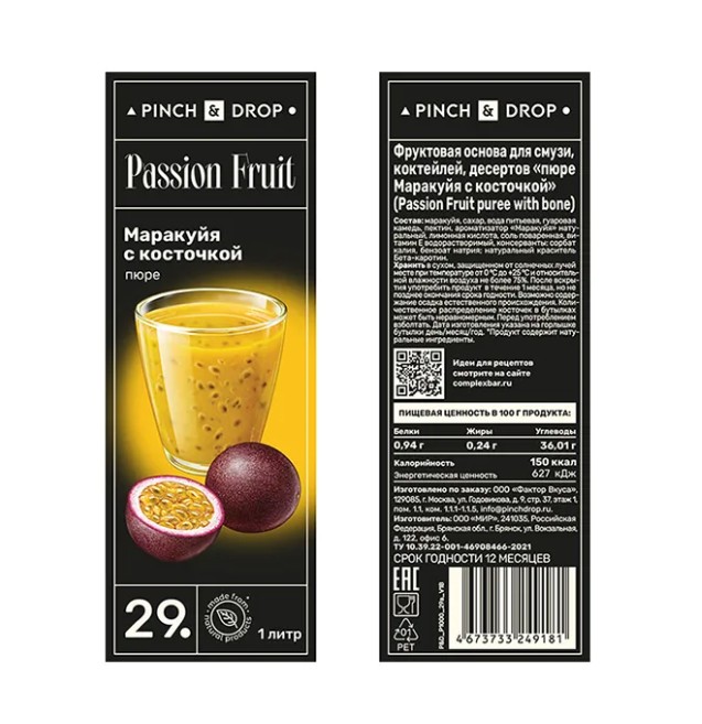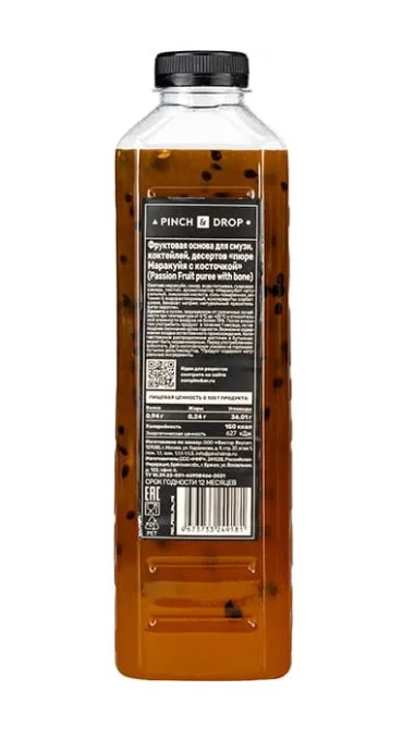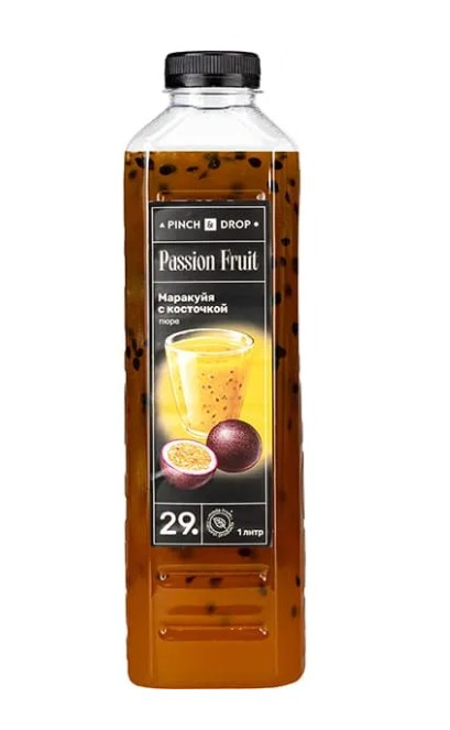 Фруктовое пюре «Маракуйя с косточкой» Pinch&Drop используется для приготовления различных напитков и десертов и сервировки блюд в кафе, ресторанах, барах и на других предприятиях общественного питания, торговли и пищевых производствах. «Маракуйя с косточкой» – это одна из самых популярных разновидностей пюре благодаря своей уникальной текстуре. В фруктовой массе встречаются мелкие черные косточки, которые придают ей особую привлекательность и подчеркивают натуральность продукта. В составе только натуральные ингредиенты из плодов. Пюре обладает ярким тропическим вкусом и сбалансированной сладостью, благодаря добавлению сахара.