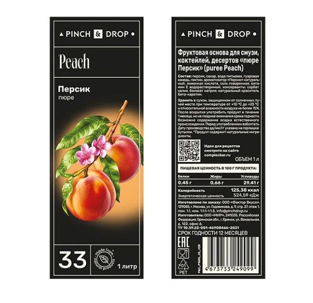 Фруктовое пюре «Персик» Pinch&Drop используется для приготовления различных напитков и десертов и сервировки блюд в кафе, ресторанах, барах и на других предприятиях общественного питания, торговли и пищевых производствах. В состав пюре входит натуральная мякоть спелого фрукта. Нежный процесс нагрева позволяет сохранить витамины A и C, а также оригинальный вкус. Его насыщенный аромат и бархатистая текстура делают пюре готовым к употреблению сразу после покупки. Легкая естественная сладость помогает контролировать калорийность и приносит гастрономическую пользу.