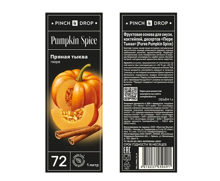 Фруктовое пюре «Пряная тыква» Pinch&Drop используется для приготовления различных напитков и десертов и сервировки блюд в кафе, ресторанах, барах и на других предприятиях общественного питания, торговли и пищевых производствах. В состав пюре входит натуральная мякоть.