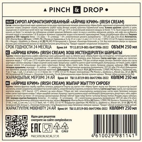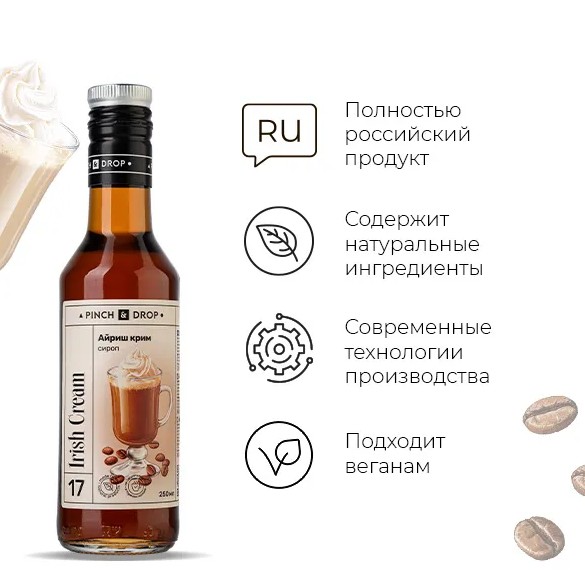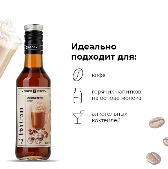 Сироп «Айриш Крим» Pinch&Drop используется для приготовления коктейлей, безалкогольных напитков, десертов, выпечки и добавления в кофе и стал незаменимым ингредиентом для кофеен, баров и ресторанов. Вкус ирландского виски изысканно дополняет сладкая ваниль и молоко, все это оттеняется отличными нотками горького шоколада.