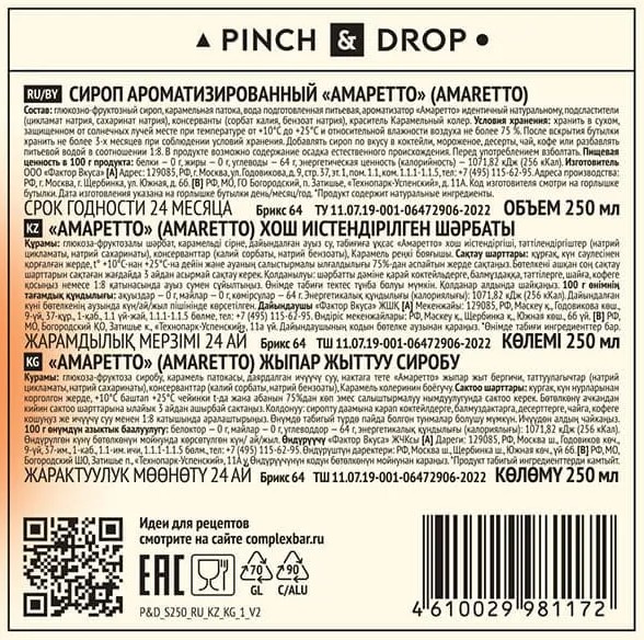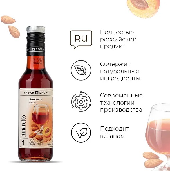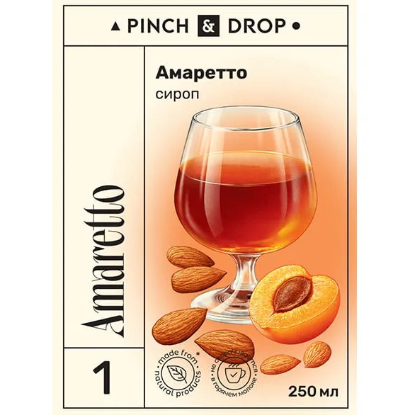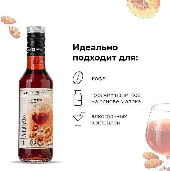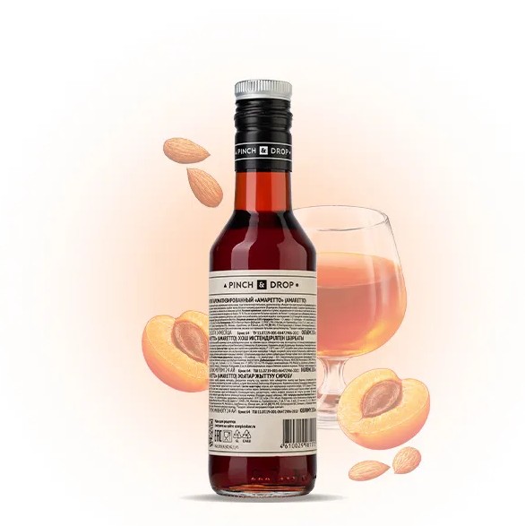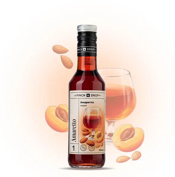 Сироп «Амаретто» Pinch&Drop используется для приготовления коктейлей, безалкогольных напитков, десертов, выпечки и добавления в кофе и стал незаменимым ингредиентом для кофеен, баров и ресторанов. Сироп обладает ярким миндальным вкусом и приятным ореховым ароматом. Добавление специй придает ему легкую пикантность. Благодаря сахару горечь практически не ощущается: она присутствует, как и в любом сиропе «Амаретто», но изысканно смягчена мягкими нотами, что не утяжеляет вкус коктейлей.