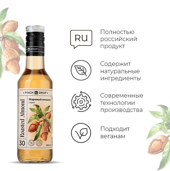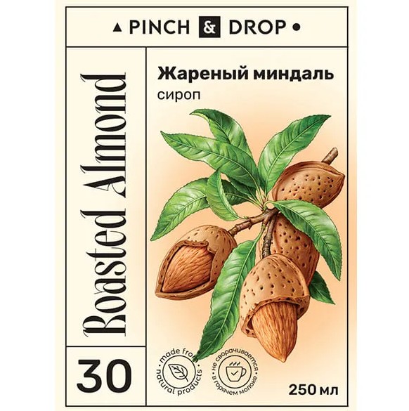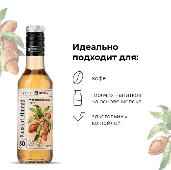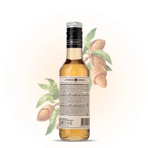 Сироп «Жареный Миндаль» Pinch&Drop используется для приготовления коктейлей, безалкогольных напитков, десертов, выпечки и добавления в кофе и стал незаменимым ингредиентом для кофеен, баров и ресторанов. Сироп «Миндаль» обладает ореховым вкусом с легкой горечью, характерной для этого замечательного ореха. Его сладость гармонично сочетается с горьковатыми оттенками и легкой пряностью, что делает его особенно востребованным в кондитерском искусстве.