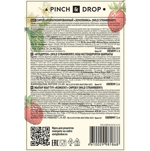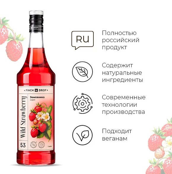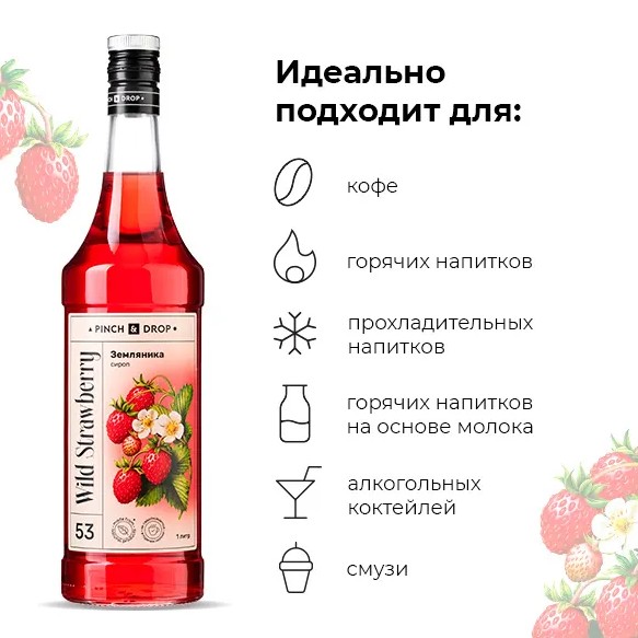 Сироп «Земляника» Pinch&Drop используется для приготовления коктейлей, безалкогольных напитков, десертов, выпечки и добавления в кофе и стал незаменимым ингредиентом для кофеен, баров и ресторанов. Сироп «Земляника» восхищает своим насыщенным вкусом и ароматом, как настоящая лесная ягода. Этот сироп порадует любителей ярких ягодных нот. Представьте себе спелую землянику, щедро посыпанную сахаром — это сладко, вкусно и поднимает настроение. Добавьте к этому приятный аромат, присущий продукту, и вы получите невероятный сироп, созданный из натуральных ингредиентов.