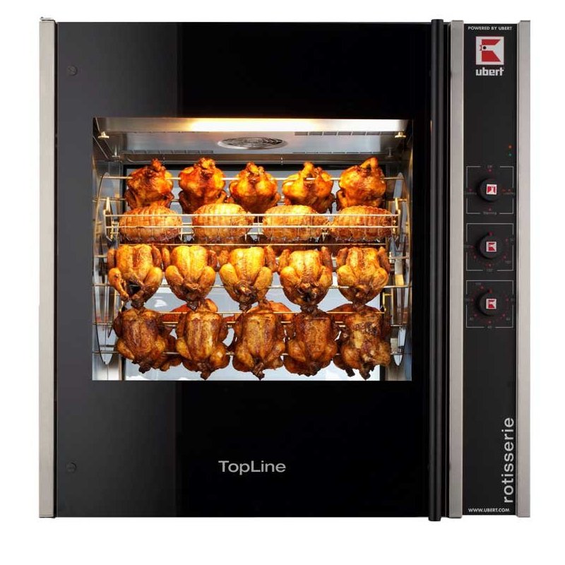 Гриль для кур Ubert RT 404 используется на предприятиях общественного питания, торговли и пищевых производствах для приготовления тушек, куриных окорочков, грудок и других продуктов. Гриль оснащен таймером, поддоном для сбора жира, подсветкой и электромеханическим управлением. Материал корпуса - нержавеющая сталь.