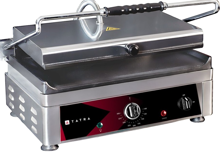 Прижимной гриль Tatra TCG 4527 SS предназначен для жарки мяса, птицы, рыбы, овощей и быстрого разогрева полуфабрикатов на предприятиях общественного питания и торговли. Модель оснащена электромеханической панелью управления с терморегулятором и индикаторами питания и нагрева и емкостью для сбора жира. Корпус выполнен из нержавеющей стали.