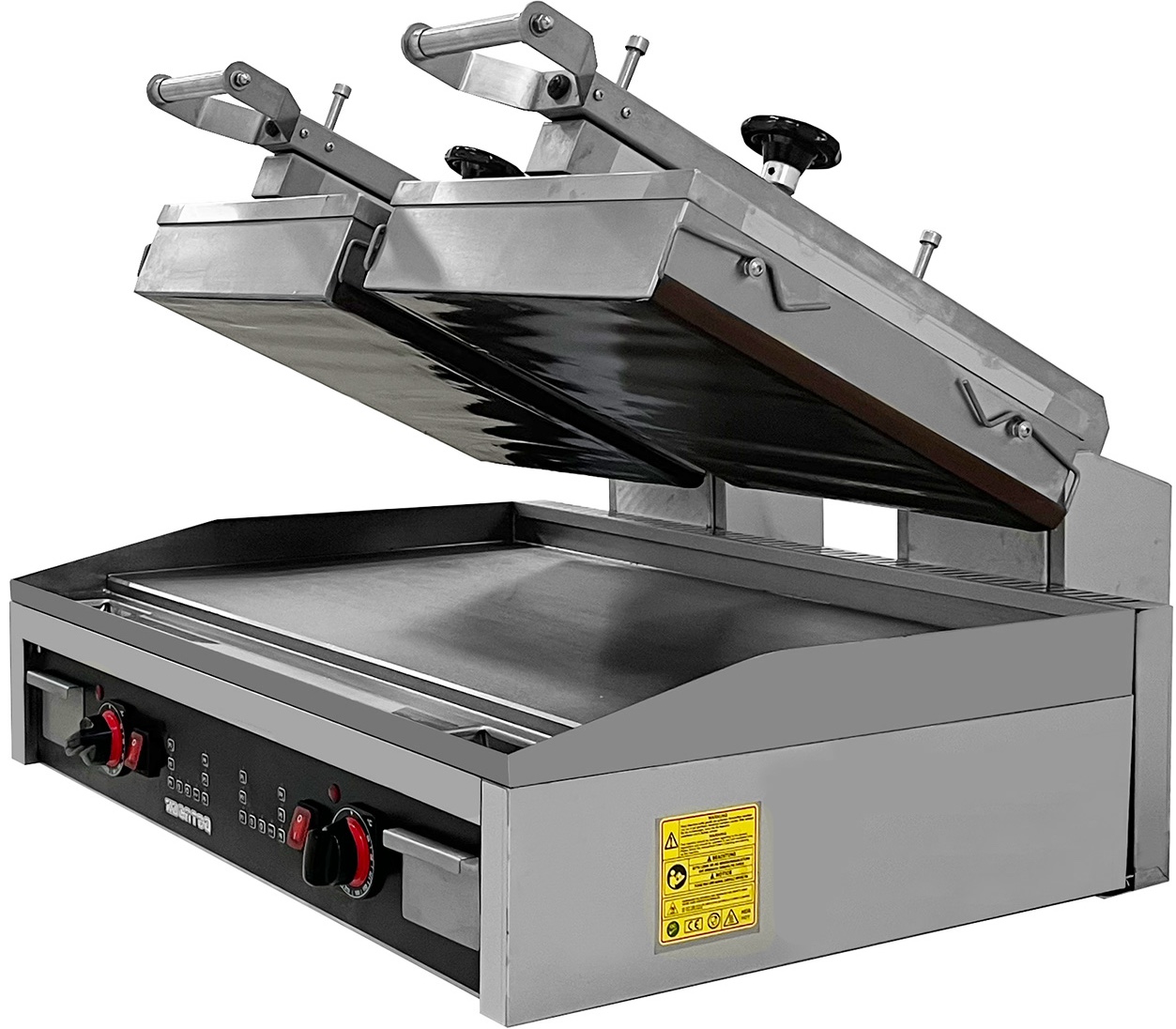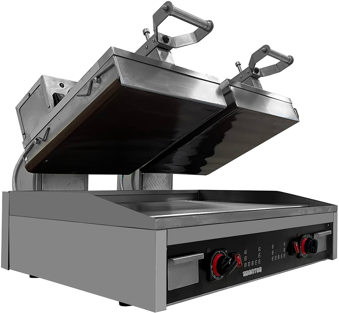 Гриль пресс Kocateq GH66ED класса heavy-duty используется на предприятиях общественного питания, торговли и пищевых производствах для жарки мяса, рыбы, овощей, приготовления гамбургеров, сэндвичей, стейков и прочих блюд. Модель оснащена цифровой панелью и термостатами регулировки температуры. Материал корпуса - высококачественная нержавеющая сталь, материал верхней пластины - тефлоновая стеклоткань, материал нижней пластины - теплопроводящий сплав, материал ножек - пластик.