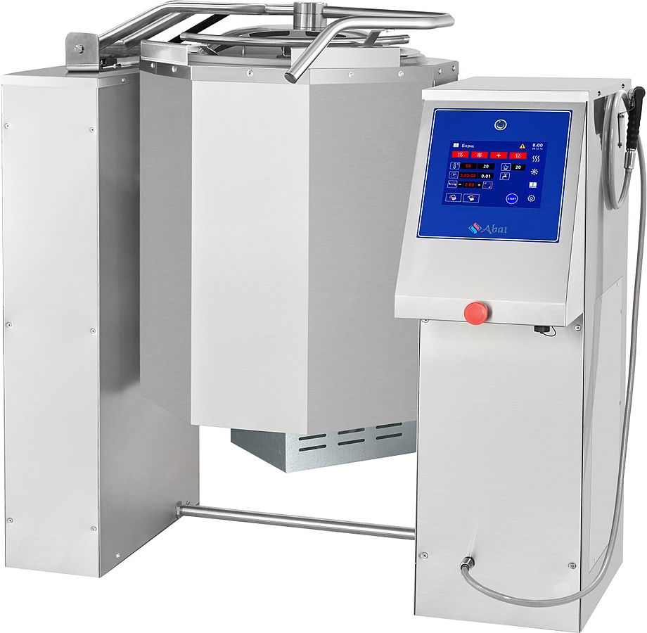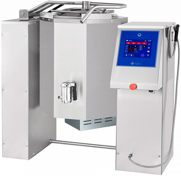 Варочный котел Abat КПЭМ-60-ОМП с функциями опрокидывания, перемешивания и охлаждения предназначен для приготовления вторых и третьих блюд, бульонов, соусов и десертов, а также для кипячения воды на предприятиях пищевой промышленности и общественного питания. Модель оснащена панелью управления с электронным TFT-экраном и пультом программного управления.