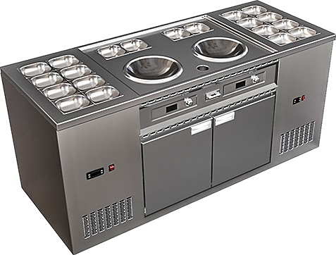 Станция WOK Astropit КС-ВОК-2003 используется на предприятиях общественного питания, торговли и пищевых производствах для разогрева и приготовления различных видов блюд. Модель оснащена 2 конфорками WOK, 2 охлаждаемыми отделениями с распашными дверьми, 2 охлаждаемыми ваннами (вместимость каждой 8 емкостей GN 1/6 глубиной 150 мм) и 2 нейтральными ваннами (вместимость каждой 2 емкости GN 1/6 глубиной 150 мм) и емкостью для отходов. Две независимые панели управления с круговыми регуляторами и цифровыми дисплеями. Материал изготовления - нержавеющая сталь.