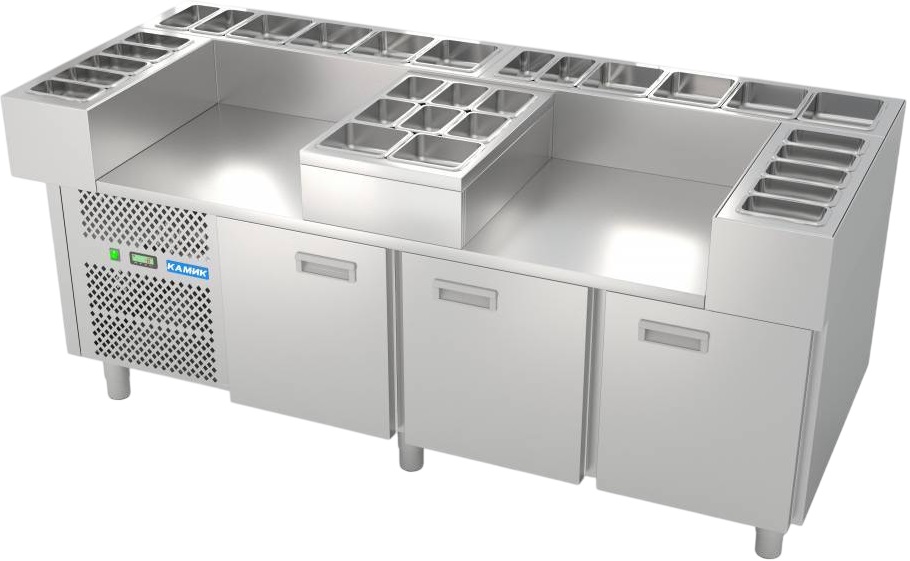 Кулинарная станция WOK КАМИК СОП-348310 используется на предприятиях общественного питания, торговли и пищевых производствах для разогрева и приготовления различных видов блюд. Модель оснащена 2 нишами под оборудование в столешнице, полкой и 3 дверьми. Материал изготовления - нержавеющая сталь AISI 304.