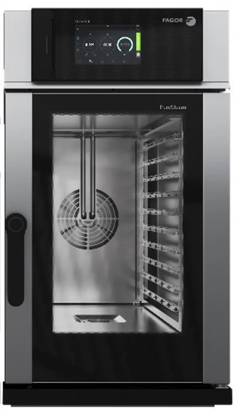 Пароконвектомат Fagor K-APW-101-E LW R K предназначен для приготовления широкого спектра блюд, а также для выпечки хлебобулочных и кондитерских изделий на предприятиях общественного питания, торговли и пищевых производствах. Модель оснащена электронной панелью управления, сенсорным экраном Touch Screen с диагональю 10,1" подсветкой камеры и термощупом. Корпус выполнен из нержавеющей стали.