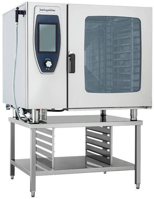 Конвекционная печь OZTI OKFG 102 C используется на предприятиях общественного питания, торговли и пищевых производствах для приготовлен кондитерских и хлебобулочных изделий, замороженных или предварительно выдержанных в расстоечном шкафу заготовок и подогрева готовых блюд. Модель оснащена сенсорным управлением, дисплеем 10", предварительным прогревом камеры, функцией Delta T, функцией быстрого охлаждения камеры, 5 скоростным вентилятором, двухступенчатой очисткой, предупреждением о неисправности, парогенератором, галогенной лампой, уплотнением на дверце, ножками и колесами. Материал камеры и бойлера - высококачественная нержавеющая сталь AISI 304, материал корпуса - высококачественная нержавеющая сталь AISI 430.