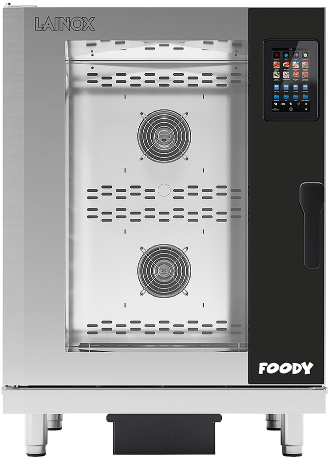 Пароконвектомат Lainox FOODY FOEN101+BPK предназначен для приготовления различных блюд, хлебобулочных и кондитерских изделий на предприятиях общественного питания, торговли и пищевых производствах. Модель оснащена Touch Screen управлением, ЖК-дисплеем с диагональю 7", автоматической мойкой, BPK, 2-скоростным вентилятором с автореверстом и дверцей с двойным закаленным стеклом, с вентиляцией, с воздушной прослойкой и внутренним атермальным стеклом с теплоотражающим покрытием. Материал рабочей камеры - штампованная нержавеющая сталь 18/10 AISI 304, материал корпуса и нагревателей - высококачественная нержавеющая сталь.