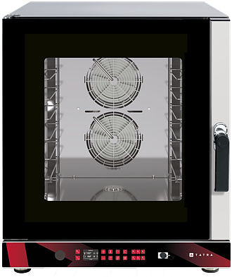 Пароконвектомат Tatra TBI 06 DC.5V предназначен для выпечки хлебобулочных и кондитерских изделий на предприятиях общественного питания, торговли и пищевых производствах. Модель оснащена электронным управлением с LCD экраном 2.4", 2 реверсивными вентиляторами, инжекторным пароувлажнением, автоматической мойкой, USB портом, подсветкой галогенной лампой и закругленными краями для легкой чистки. Материал камеры и корпуса - высококачественная нержавеющая сталь, материал дверцы - двойное жаропрочное стекло.