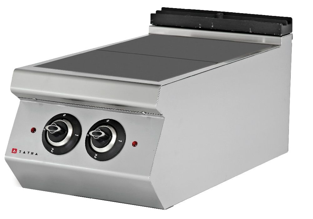 Электрическая плита Tatra TER.47 700 серии предназначена для жарки мяса, птицы, рыбы, овощей и быстрого разогрева полуфабрикатов на предприятиях общественного питания и торговли. Модель оснащена электромеханической панелью управления, двумя низкими чугунными конфорками и регулируемыми ножками. Корпус выполнен из нержавеющей стали.