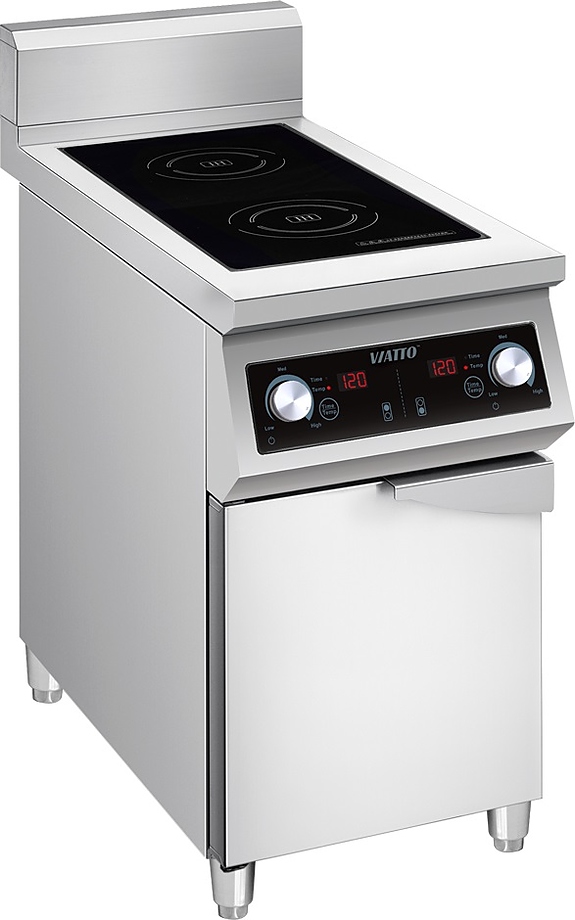 Электрическая плита VIATTO VA-500G2 используется на предприятиях общественного питания, торговли и пищевых производствах для приготовления широкого спектра блюд в наплитной посуде. Тип установки - напольная. Сплошная варочная поверхность. Модель оснащена подставкой со встроенным шкафом. Регулировка температуры и длительности приготовления при помощи электромеханической панели, индикация заданных параметров осуществляется на светодиодных цифровых дисплеях. Материал корпуса - нержавеющая сталь.