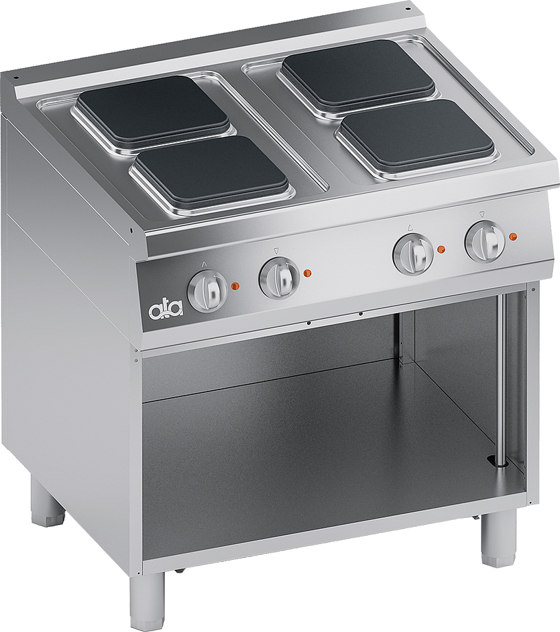 Электрическая плита ATA K7ECU10VVQ используется на предприятиях общественного питания, торговли и пищевых производствах для приготовления широкого спектра блюд в наплитной посуде. Модель оснащена температурным датчиком, шкафом для инвентаря и регулируемыми ножками. Материал корпуса и ножек - высококачественная нержавеющая сталь, материал рабочей поверхности и передней панели - нержавеющая сталь AISI 304, материал атермических ручек - пластик с трафаретной печатью по краям, материал конфорок - чугун.