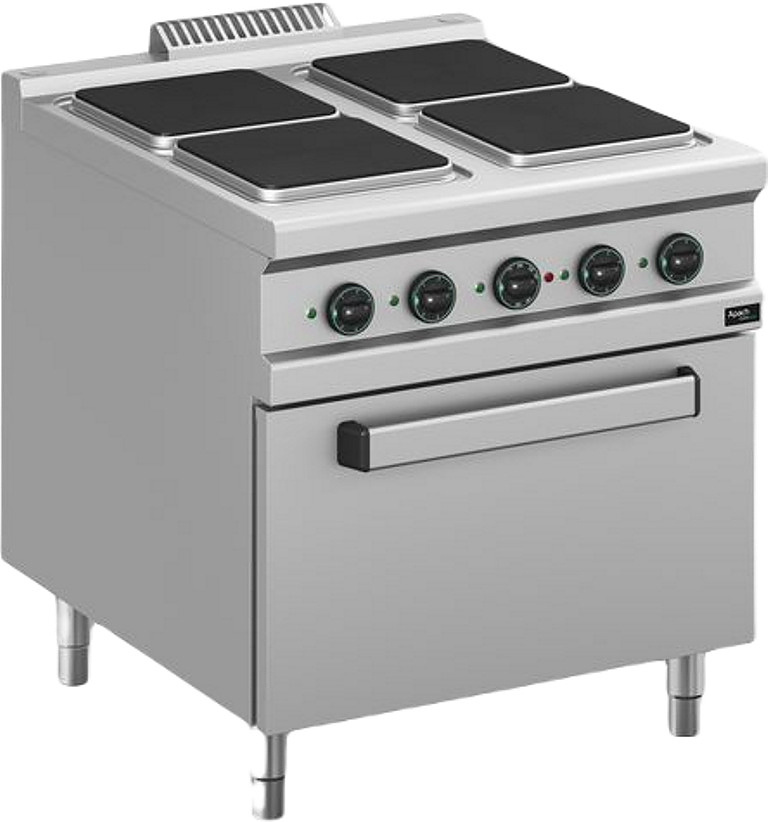 Электрическая плита Apach APRES-77FE/PL серии 900 используется на предприятиях общественного питания, торговли и пищевых производствах для варки, тушения, жарки блюд из мяса, птицы, рыбы и овощей. Модель оснащена электромеханическим управлением, терморегулятором, световыми индикаторами, быстро нагревающимися конфорками, защитой от перегрева конфорок, гидроизолированной поверхностью, лотком сбора остатков пищи, масла или жира, конвекционным жарочным шкафом и регулируемыми ножками. Материал корпуса, рабочей поверхности, панели управления и вытяжной решетки - высококачественная нержавеющая сталь AISI 304, материал боковин и задней панели - нержавеющая сталь AISI 430, материал жарочной поверхности - легированная сталь.