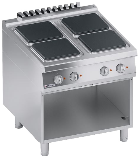 Электрическая плита Veroterm VT4CUEP10VV серии 900 используется на предприятиях общественного питания, торговли и пищевых производствах для приготовления различных блюд в наплитной посуде. Модель оснащена механическим управлением, индикаторам, открытой подставкой и регуляторами температуры. Материал изделия - высококачественная нержавеющая сталь (толщина 1 мм).
