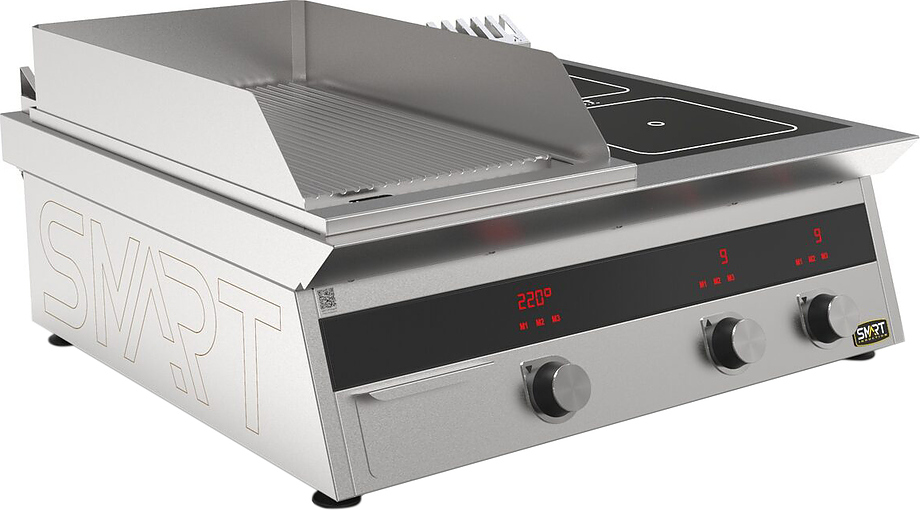 Индукционная плита SMART INDUCTION K94-5RKN (с грилем) серии 900 используется на предприятиях общественного питания, торговли и пищевых производствах для приготовления и разогрева различных видов блюд в специализированной посуде. Модель оснащена электро-механическим управлением и сенсорными кнопками, индикаторами, 2 жировым фильтрами съемными, ящиком для масла, жира и остатков пищи и регулируемыми ножками. Материал корпуса и столешницы - высококачественная нержавеющая сталь AISI 430, материал рабочей поверхности - стеклокерамика, материал рабочей поверхности гриля и передней панели - нержавеющая сталь.