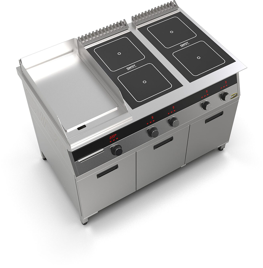 Индукционная плита SMART INDUCTION K96-3PKN (с грилем) серии 900 используется на предприятиях общественного питания, торговли и пищевых производствах для приготовления и разогрева различных видов блюд в специализированной посуде. Модель оснащена электро-механическим управлением, сенсорными кнопками, индикаторами, 3 жировыми фильтрами съемным, 2 ящиками для сбора масла, жира и остатков пищи и регулируемыми ножками. Материал корпуса, столешницы и воздуховода - высококачественная нержавеющая сталь AISI 430, материал рабочей поверхности плиты - стеклокерамика, материал передней панели и поверхности гриля - нержавеющая сталь.