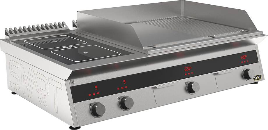 Индукционная плита SMART INDUCTION K76-3KPRN (с грилем) серии 700 используется на предприятиях общественного питания, торговли и пищевых производствах для приготовления и разогрева различных видов блюд в специализированной посуде. Модель оснащена электро-механическим управлением, сенсорными кнопками, индикаторами, 3 жировыми фильтрами съемным, 2 ящиками для сбора масла, жира и остатков пищи и регулируемыми ножками. Материал корпуса, столешницы и воздуховода - высококачественная нержавеющая сталь AISI 430, материал рабочей поверхности - стеклокерамика, материал поверхности гриля и передней панели - нержавеющая сталь.
