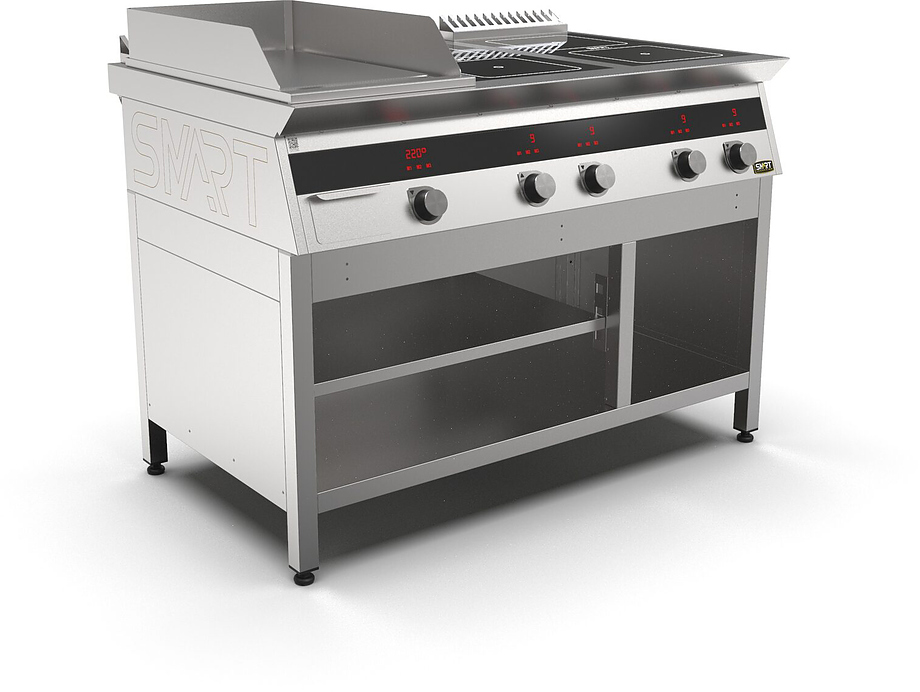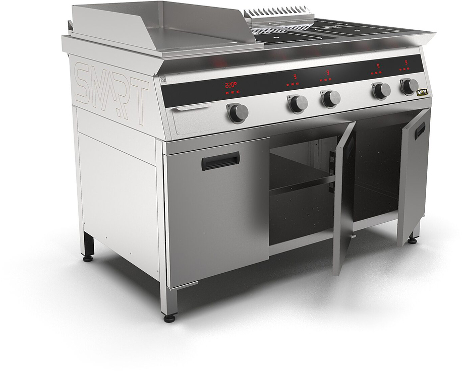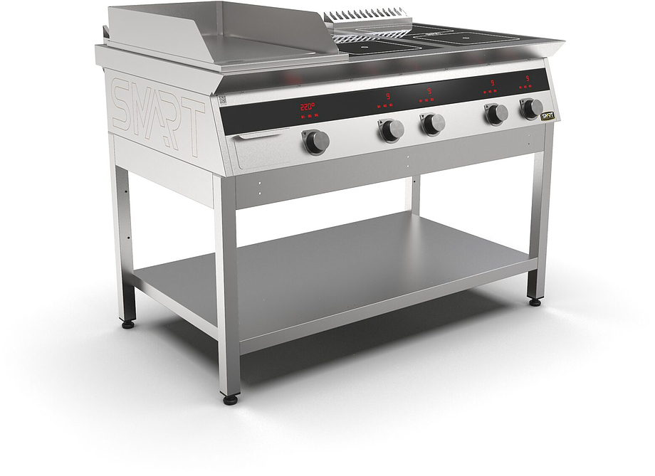 Индукционная плита SMART INDUCTION K96-35PKN (с грилем) серии 900 используется на предприятиях общественного питания, торговли и пищевых производствах для приготовления и разогрева различных видов блюд в специализированной посуде. Модель оснащена электро-механическим управлением, сенсорными кнопками, индикаторами, 3 жировыми фильтрами съемным, 2 ящиками для сбора масла, жира и остатков пищи и регулируемыми ножками. Материал корпуса, столешницы и воздуховода - высококачественная нержавеющая сталь AISI 430, материал рабочей поверхности плиты - стеклокерамика, материал передней панели и поверхности гриля - нержавеющая сталь.
