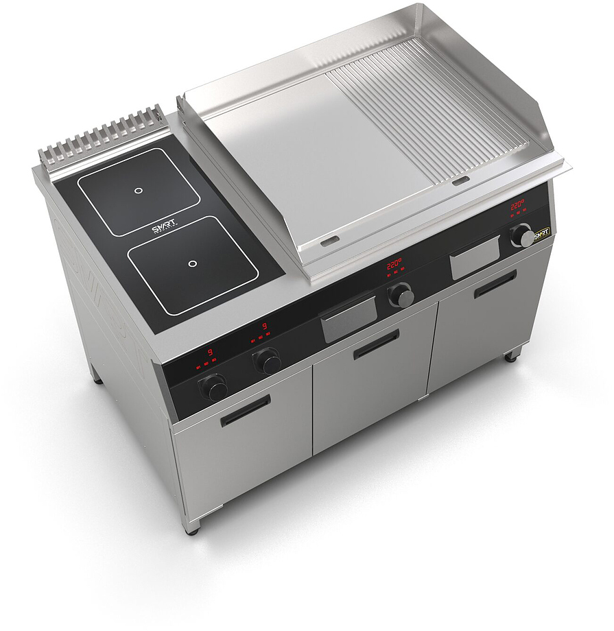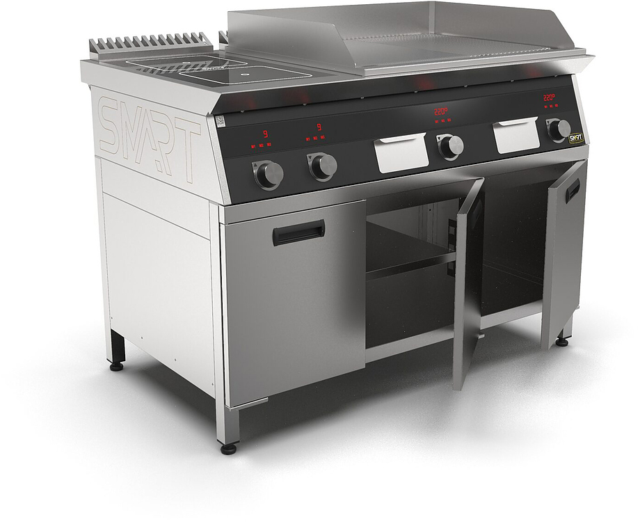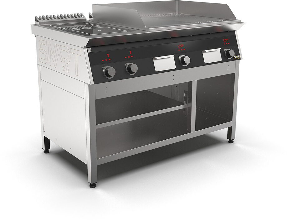 Индукционная плита SMART INDUCTION K76-35KPRB (с грилем) серии 700 используется на предприятиях общественного питания, торговли и пищевых производствах для приготовления и разогрева различных видов блюд в специализированной посуде. Модель оснащена электро-механическим управлением, сенсорными кнопками, индикаторами, 3 жировыми фильтрами съемным, 2 ящиками для сбора масла, жира и остатков пищи и регулируемыми ножками. Материал корпуса, столешницы и воздуховода - высококачественная нержавеющая сталь AISI 430, материал рабочей поверхности - стеклокерамика, материал поверхности гриля - нержавеющая сталь, материал передней панели - стойкое полимерное покрытие черного цвета.