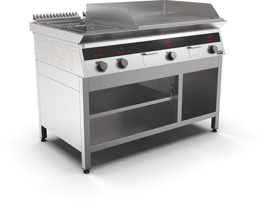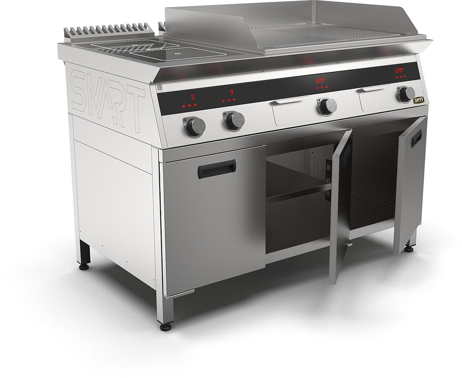 Индукционная плита SMART INDUCTION K76-5KPRN (с грилем) серии 700 используется на предприятиях общественного питания, торговли и пищевых производствах для приготовления и разогрева различных видов блюд в специализированной посуде. Модель оснащена электро-механическим управлением, сенсорными кнопками, индикаторами, 3 жировыми фильтрами съемным, 2 ящиками для сбора масла, жира и остатков пищи и регулируемыми ножками. Материал корпуса, столешницы и воздуховода - высококачественная нержавеющая сталь AISI 430, материал рабочей поверхности - стеклокерамика, материал поверхности гриля и передней панели - нержавеющая сталь.