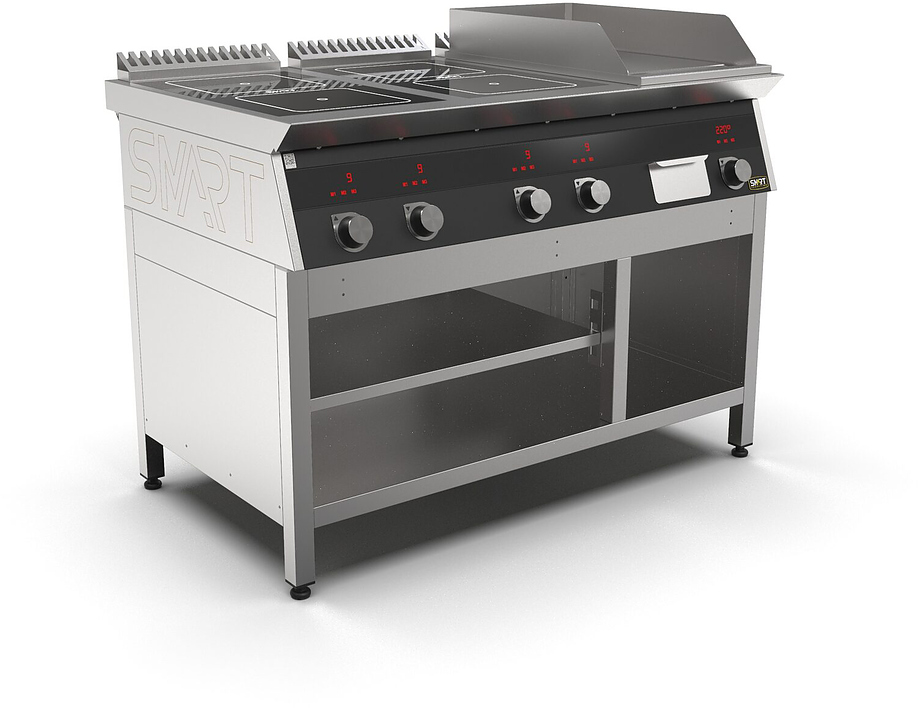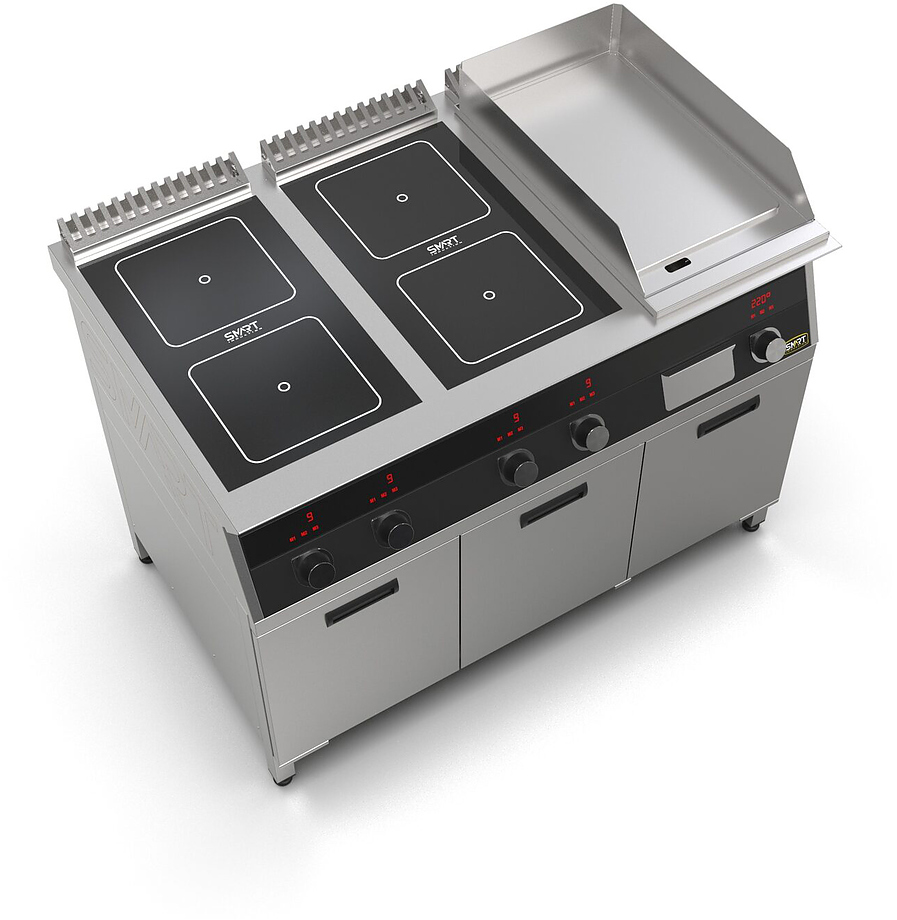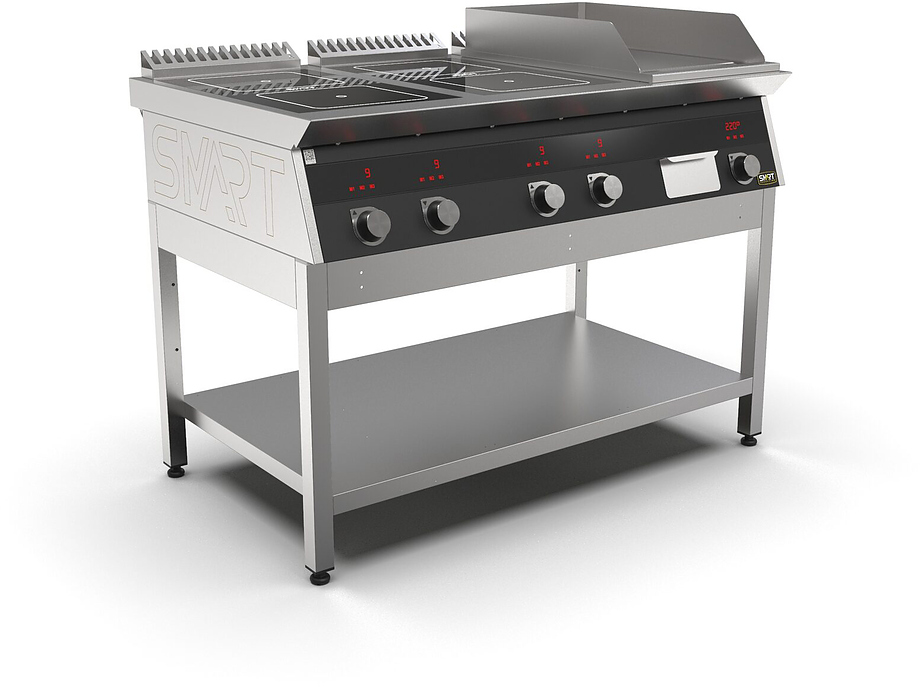 Индукционная плита SMART INDUCTION K96-5KPB (с грилем) серии 900 используется на предприятиях общественного питания, торговли и пищевых производствах для приготовления и разогрева различных видов блюд в специализированной посуде. Модель оснащена электро-механическим управлением, сенсорными кнопками, индикаторами, 3 жировыми фильтрами съемным, 2 ящиками для сбора масла, жира и остатков пищи и регулируемыми ножками. Материал корпуса, столешницы и воздуховода - высококачественная нержавеющая сталь AISI 430, материал поверхности гриля - нержавеющая сталь, материал рабочей поверхности плиты - стеклокерамика, материал передней панели - стойкое полимерное покрытие черного цвета.