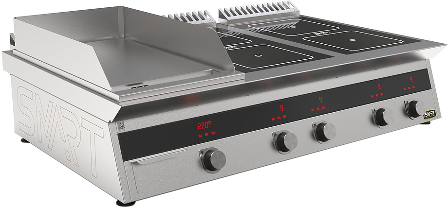 Индукционная плита SMART INDUCTION K96-5PKN (с грилем) серии 900 используется на предприятиях общественного питания, торговли и пищевых производствах для приготовления и разогрева различных видов блюд в специализированной посуде. Модель оснащена электро-механическим управлением, сенсорными кнопками, индикаторами, 3 жировыми фильтрами съемным, 2 ящиками для сбора масла, жира и остатков пищи и регулируемыми ножками. Материал корпуса, столешницы и воздуховода - высококачественная нержавеющая сталь AISI 430, материал рабочей поверхности плиты - стеклокерамика, материал передней панели и поверхности гриля - нержавеющая сталь.