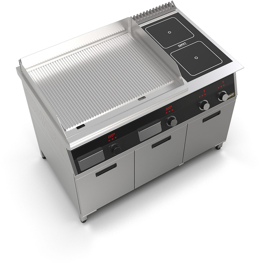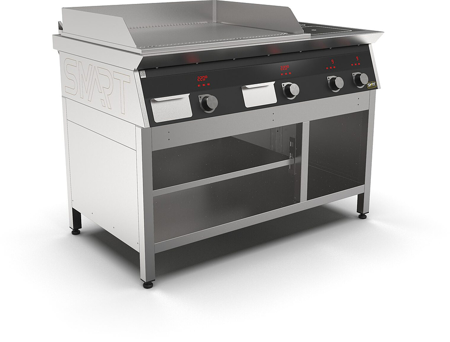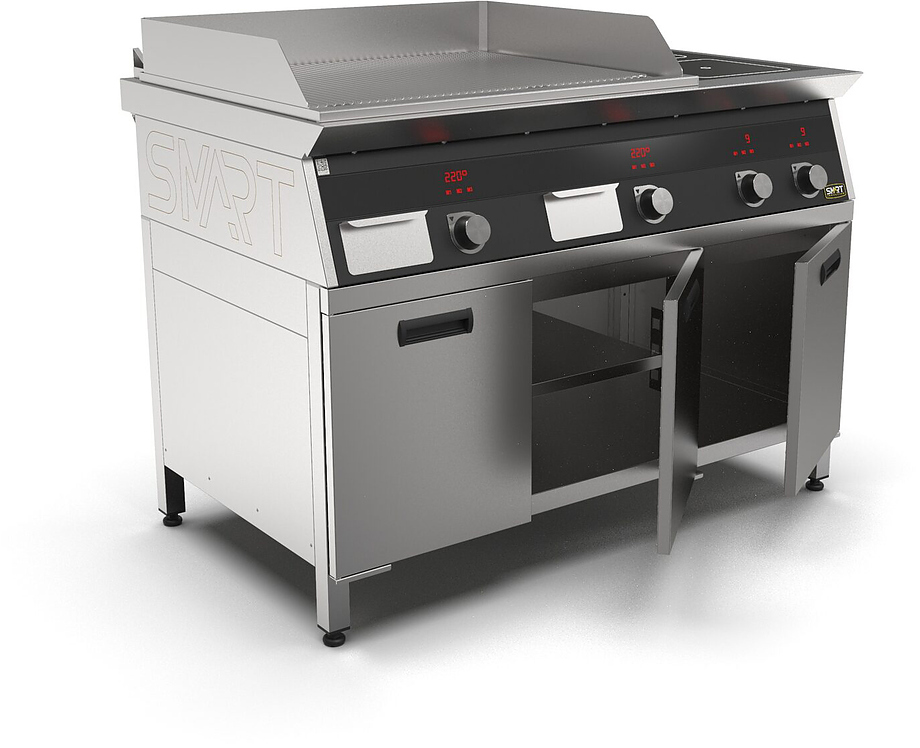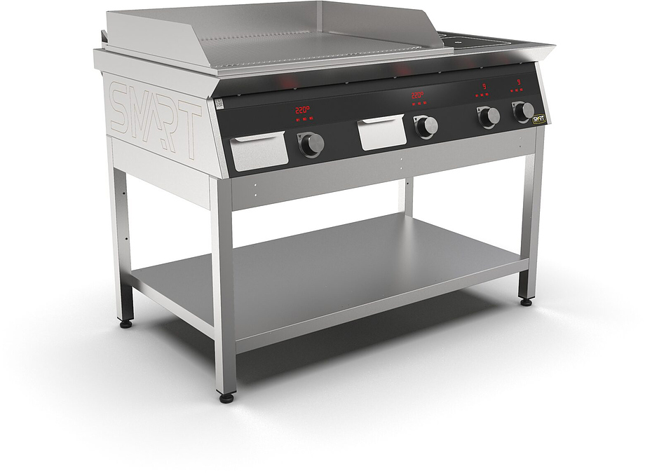Индукционная плита SMART INDUCTION K76-5RRKB (с грилем) серии 700 используется на предприятиях общественного питания, торговли и пищевых производствах для приготовления и разогрева различных видов блюд в специализированной посуде. Модель оснащена электро-механическим управлением, сенсорными кнопками, индикаторами, 3 жировыми фильтрами съемным, 2 ящиками для сбора масла, жира и остатков пищи и регулируемыми ножками. Материал корпуса, столешницы и воздуховода - высококачественная нержавеющая сталь AISI 430, материал рабочей поверхности - стеклокерамика, материал поверхности гриля - нержавеющая сталь, материал передней панели - стойкое полимерное покрытие черного цвета.