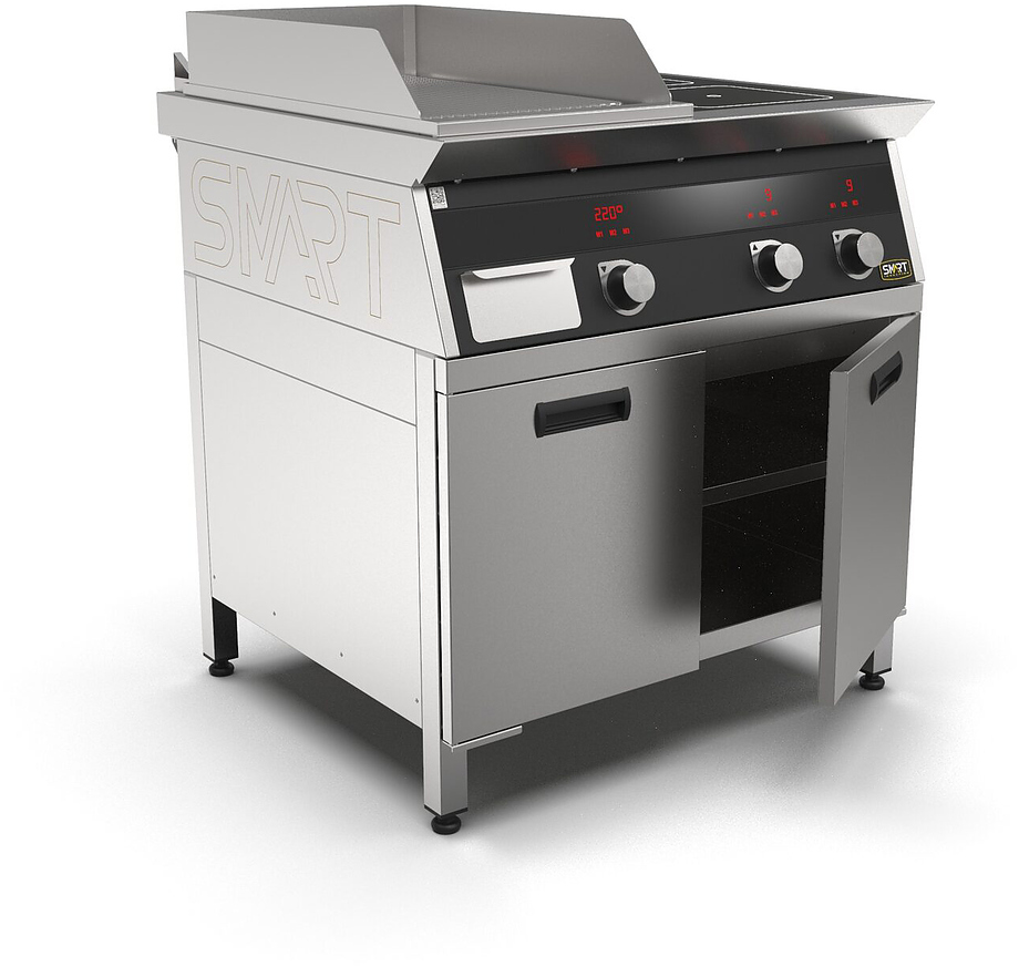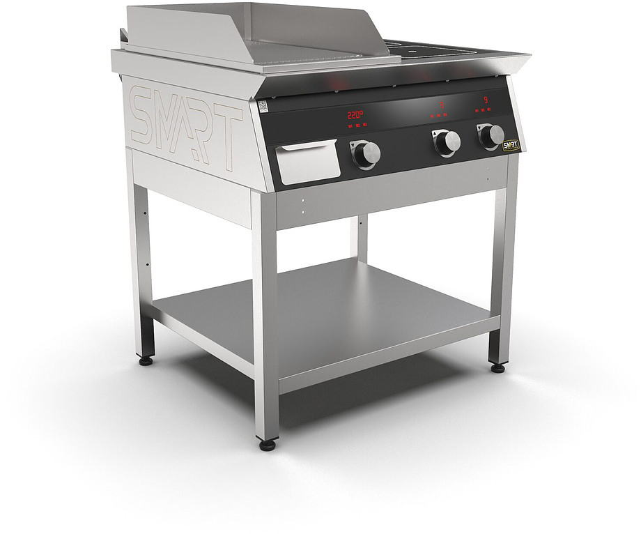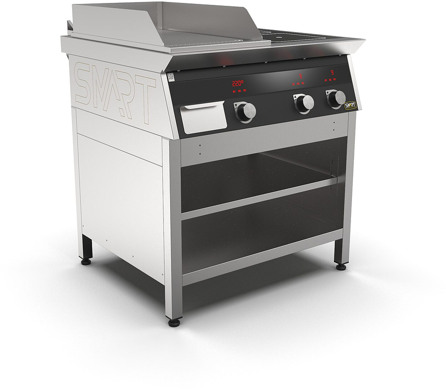 Индукционная плита SMART INDUCTION K94-35RKB (с грилем) серии 900 используется на предприятиях общественного питания, торговли и пищевых производствах для приготовления и разогрева различных видов блюд в специализированной посуде. Модель оснащена электро-механическим управлением и сенсорными кнопками, индикаторами, 2 жировым фильтрами съемными, ящиком для масла, жира и остатков пищи и регулируемыми ножками. Материал корпуса и столешницы - высококачественная нержавеющая сталь AISI 430, материал рабочей поверхности - стеклокерамика, материал рабочей поверхности гриля - нержавеющая сталь, материал передней панели - стойкое полимерное покрытие черного цвета.