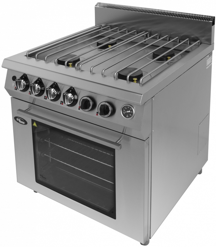 Плита газовая Grill Master Ф4ПДГ/900 серии 900 используется на предприятиях общественного питания, торговли и пищевых производствах для разогрева и приготовления различных видов блюд. Модель оснащена 4 горелками класса Heavy Duty, запальным розжигом, 2 газовыми термостатами для духовки, газ-контролем, таймером, подсветкой, решеткой и смотровым окном. Материал изделия - высококачественная нержавеющая сталь, материал двери - закаленное стекло.