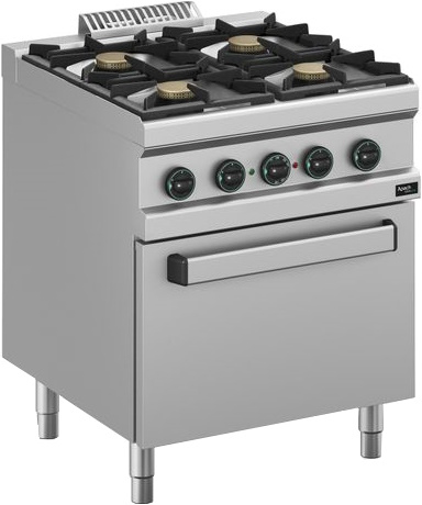 Газовая плита Apach APRG-77FE/PL 700-й серии предназначена для приготовления различных блюд из мяса, птицы, рыбы и овощей в наплитной посуде на предприятиях общественного питания и торговли. Модель оснащена электромеханической панелью управления, гидроизолированной прессованной поверхностью и регулируемыми по высоте ножками. Корпус, рабочая поверхность, панель управления и вытяжная решетка выполнены из нержавеющей стали AISI 304, боковые и задняя панели - из нержавеющей стали AISI 430, решетки выполнены из чугуна, горелки - из эмалированного чугуна, распределительные головки - из латуни.