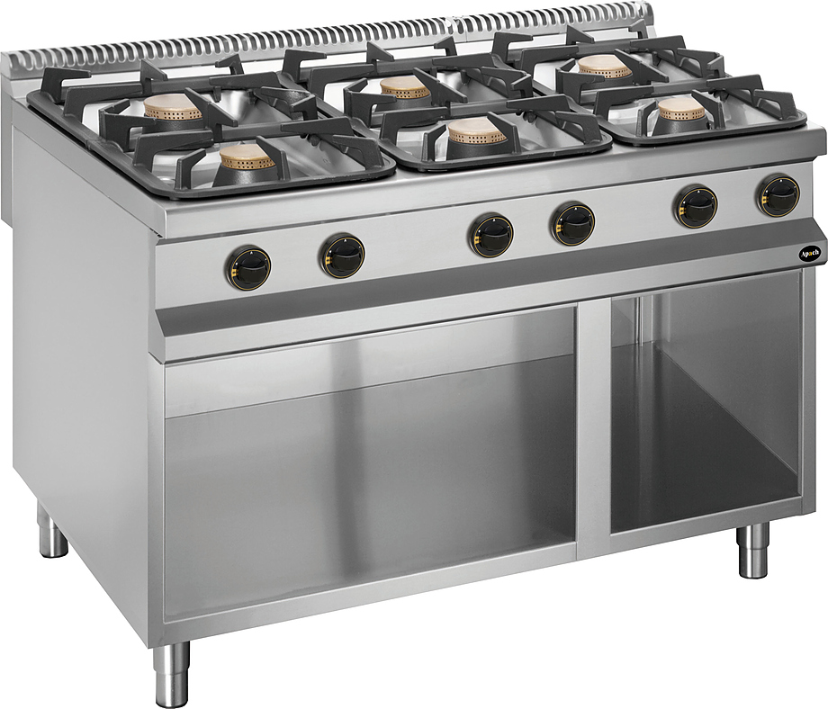 Газовая плита Apach APRG-129P/PL 900-й серии предназначена для приготовления различных блюд из мяса, птицы, рыбы и овощей в наплитной посуде на предприятиях общественного питания и торговли. Модель оснащена электромеханической панелью управления, гидроизолированной прессованной поверхностью и открытой подставкой с регулируемыми по высоте ножками. Корпус, рабочая поверхность, панель управления и вытяжная решетка выполнены из нержавеющей стали AISI 304, боковые и задняя панели - из нержавеющей стали AISI 430, решетки выполнены из чугуна, горелки - из эмалированного чугуна, распределительные головки - из латуни.