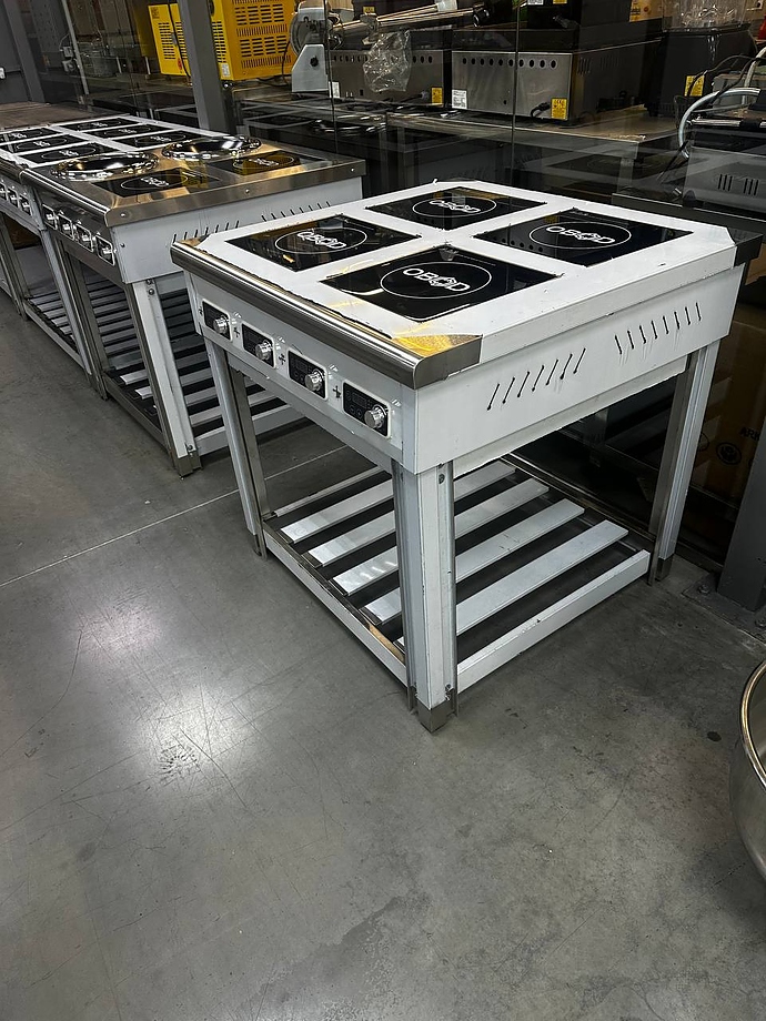 Индукционная плита OBOD ИП-004 предназначена для приготовления широкого спектра блюд в наплитной посуде на предприятиях общественного питания, торговли и пищевых производствах. Плита оснащена 4 независимыми варочными зонами, открытой подставкой и электромеханической панелью управления. Материал корпуса - нержавеющая сталь, материал рабочей поверхности - стеклокерамика.