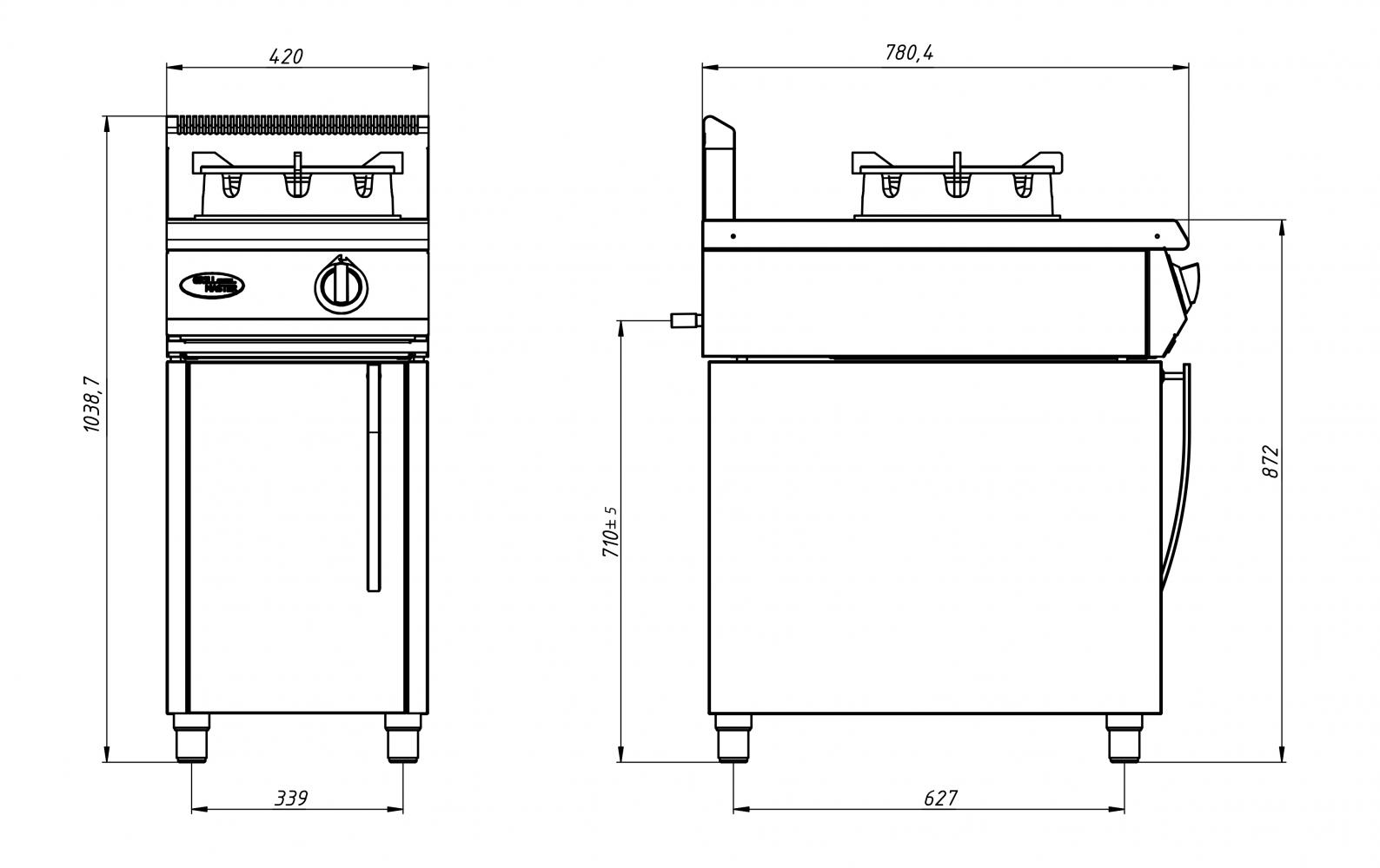 Плита газовая Grill Master Ф1ДГ/800 используется на предприятиях общественного питания, торговли и пищевых производствах для разогрева и приготовления различных видов блюд в WOK-сковородах. Модель оснащена системой газ-контроля, пьезоподжигом, запальной системой розжига и шкафом для хранения инвентаря. Материал изделия - высококачественная нержавеющая сталь.