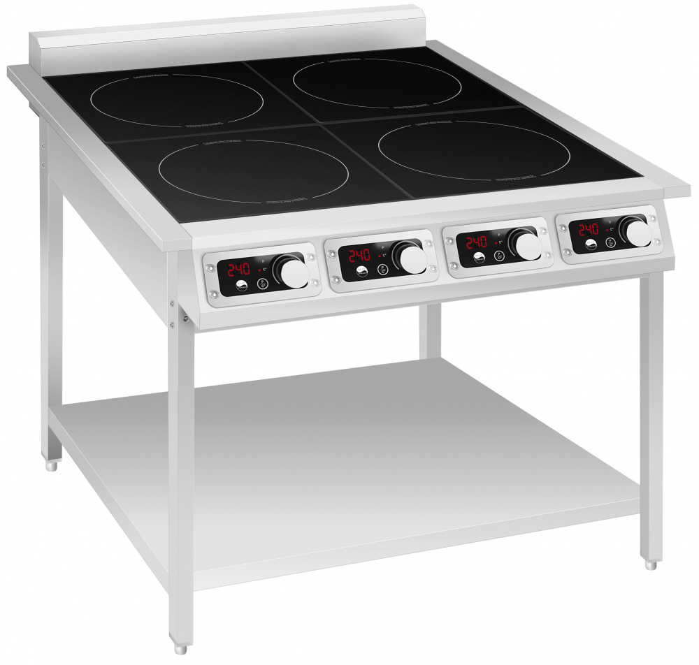 Индукционная плита INDOKOR IN3500-4PRO на подставке предназначена для приготовления и быстрого разогрева блюд на предприятиях общественного питания, торговли и производствах. Корпус плиты и лицевая панель выполнены из нержавеющей стали. Электромеханическая панель управления.