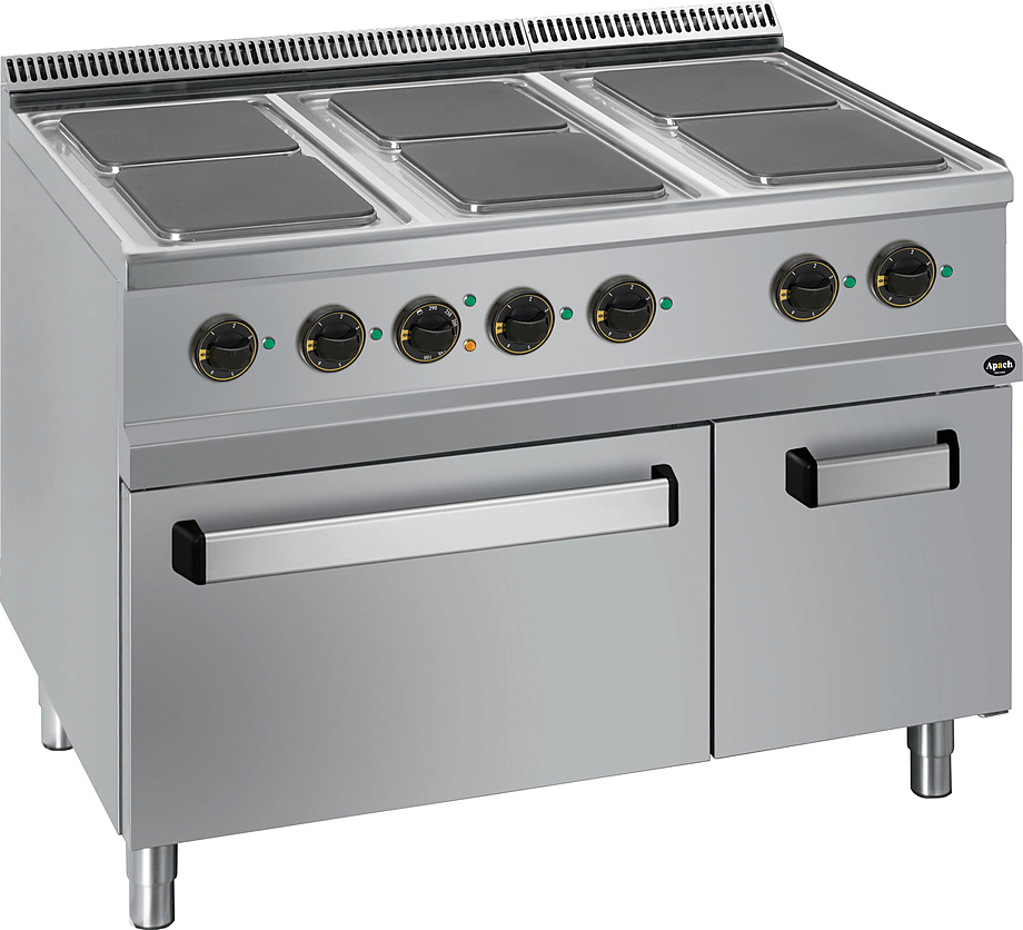 Электрическая плита Apach APRE-117FE 700-й серии предназначена для приготовления различных блюд из мяса, птицы, рыбы и овощей в наплитной посуде на предприятиях общественного питания и торговли. Модель оснащена электромеханической панелью управления, быстро нагревающимися конфорками, гидроизолированной прессованной поверхностью и регулируемыми по высоте ножками. Корпус, рабочая поверхность, панель управления и вытяжная решетка выполнены из нержавеющей стали AISI 304, боковые и задняя панели - из нержавеющей стали AISI 430.